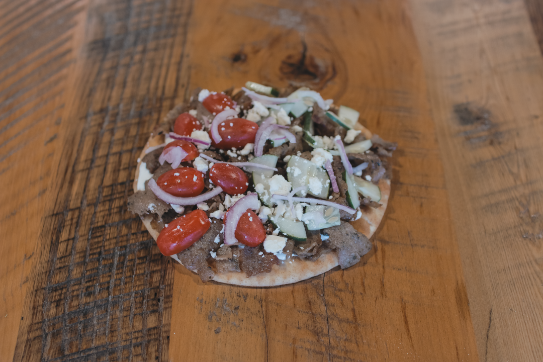 Gyro Meat, Tzatziki, Feta, Cucumbers, Tomato & Red Onion on a Pita