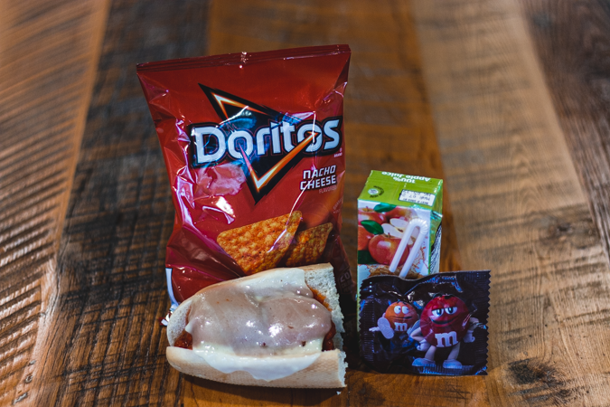 Meatballs, Marinara, Provolone. Includes Chips, Apple Juice & M&M’s.